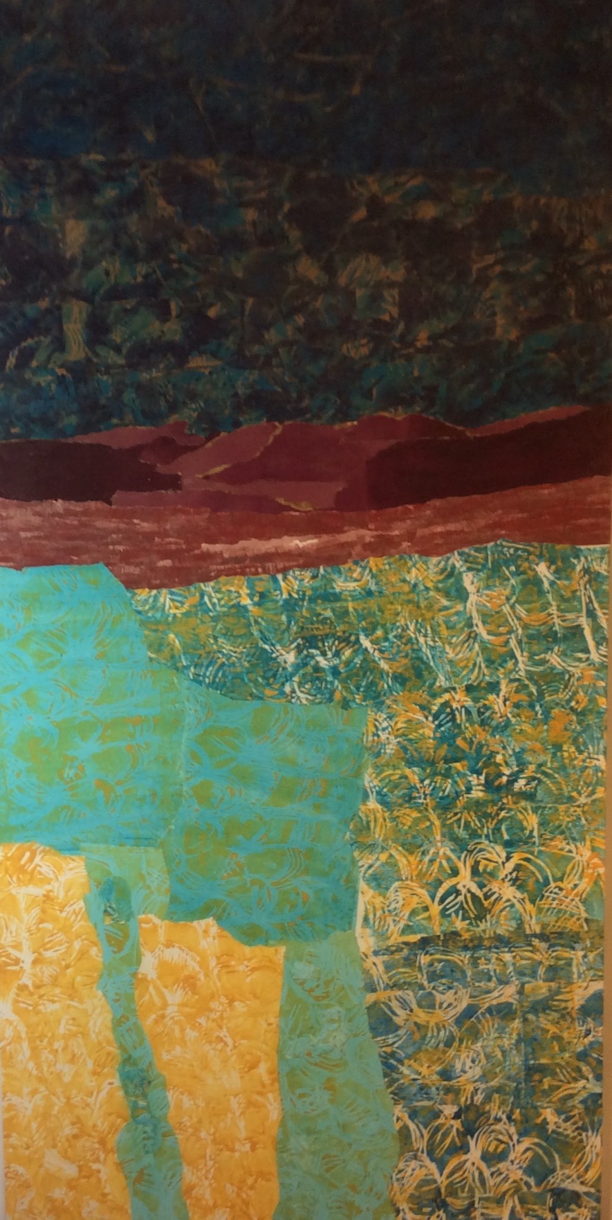 Avec la peinture acrylique et le collage, je transforme la matière pour construire un nouvel univers, pour le recoller morceau par morceau, couche par couche. J’utilise les formes, les textures et les couleurs pour créer des espaces inspirés des questions environnementales et politiques de l’heure, en équilibre entre la tension et l’harmonie. J’explore les multiples territoires qui nous habitent, naturels, imaginaires et politiques.